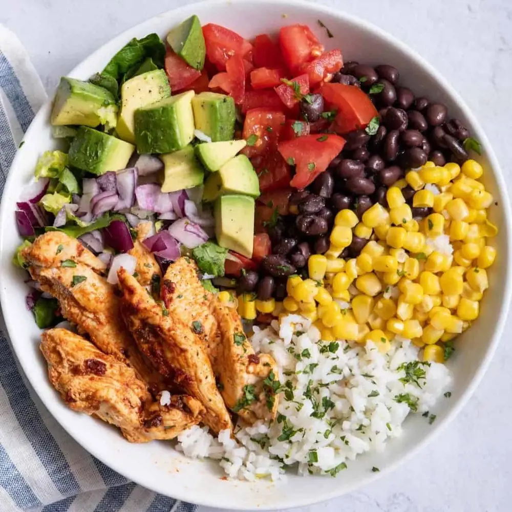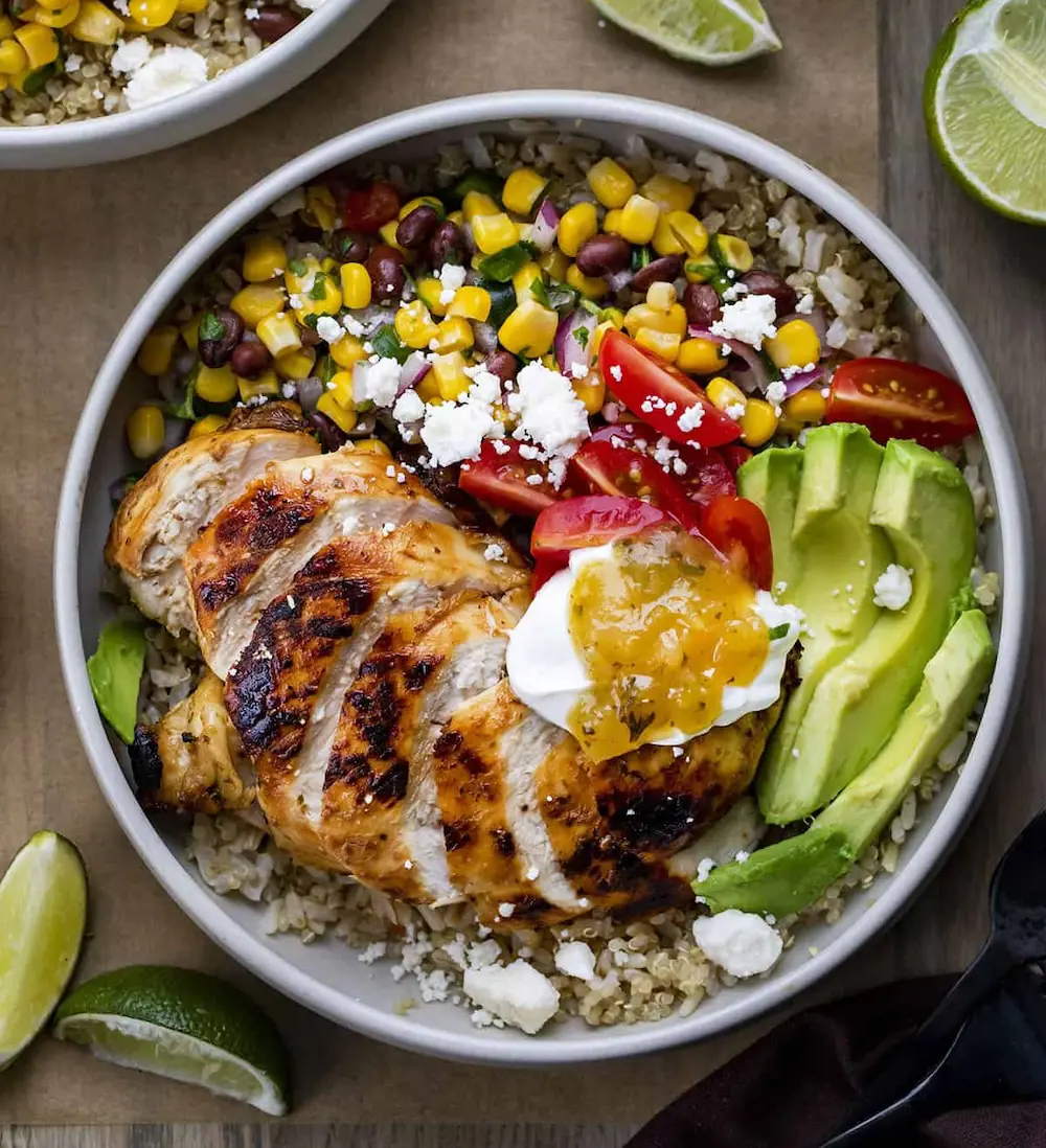 To make the iconic Baja chicken bowls, you start with grilled or seasoned chicken. It is then accompanied by a colorful array of ingredients like cilantro-lime rice, black beans, fresh salsa, creamy avocado, and a drizzle of zesty lime crema.