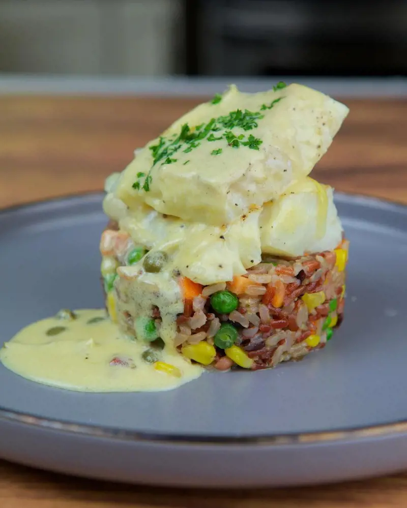 Experience the delectable essence of baked Cod, taken to new levels with a tantalizing creamy lemon butter sauce. Each tender bite reveals the flawless harmony of zesty citrus and velvety richness. Complemented by a bed of mixed-grain rice, this dish offers a delightful blend of nutty and earthy flavors, enhancing the depth and texture of each forkful.