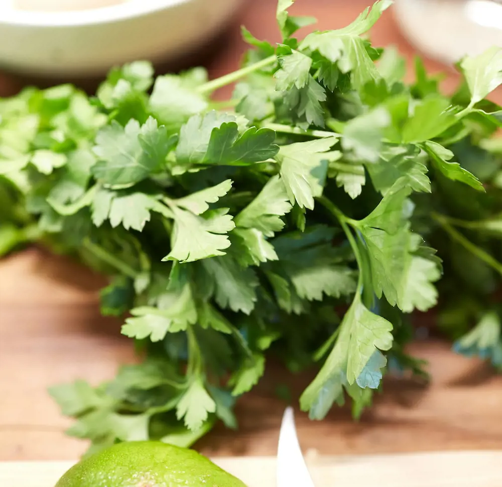 Use Italian parsley rather than curly parsley, which has a milder flavor. Chop the parsley leaves finely to release all the herbal flavors. Parsley lacks the citrus notes of coriander but still gives a pleasant green flavor. Use it as a garnish in Indian dishes, Thai curries, chimichurri sauce, and salsa.