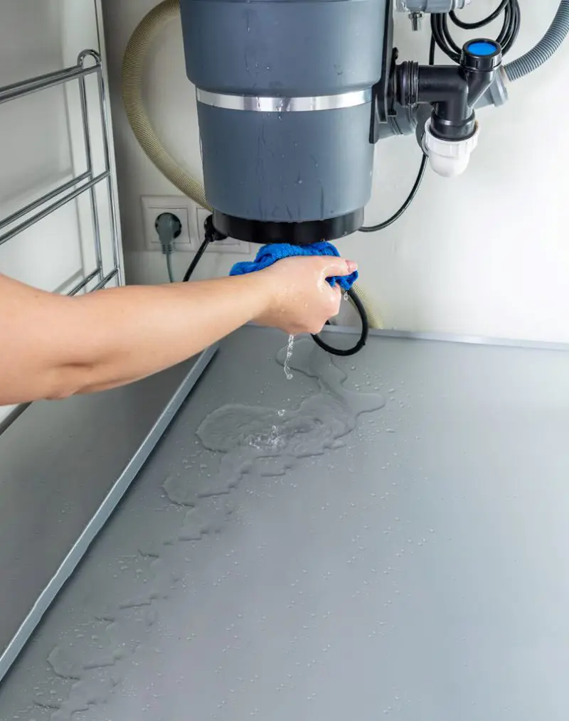 Leaks can happen in different parts of the garbage disposal, like the sink flange, dishwasher connection, or discharge drainpipe. Figuring out the exact source of the leak can be difficult. A professional plumber can quickly find and repair leaks effectively.