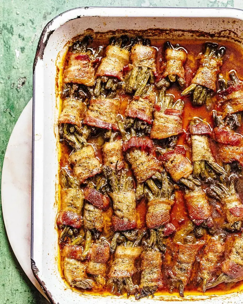 Bacon adds a rich, savory, and smoky flavor to the dish as it crisps up in the oven. If you want to prevent disassembling, secure the ends with toothpicks. For added sweetness, you can brush the bacon-wrapped green beans with a bit of maple syrup before roasting.