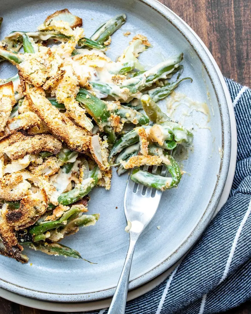 The creamy and savory element in a Green Bean Casserole is typically provided by a can of condensed cream of mushroom soup. This soup acts as a binder, coating the green beans and contributing to the overall creaminess of the dish. Overall, a vibrant and creamy gets ready to be devoured!