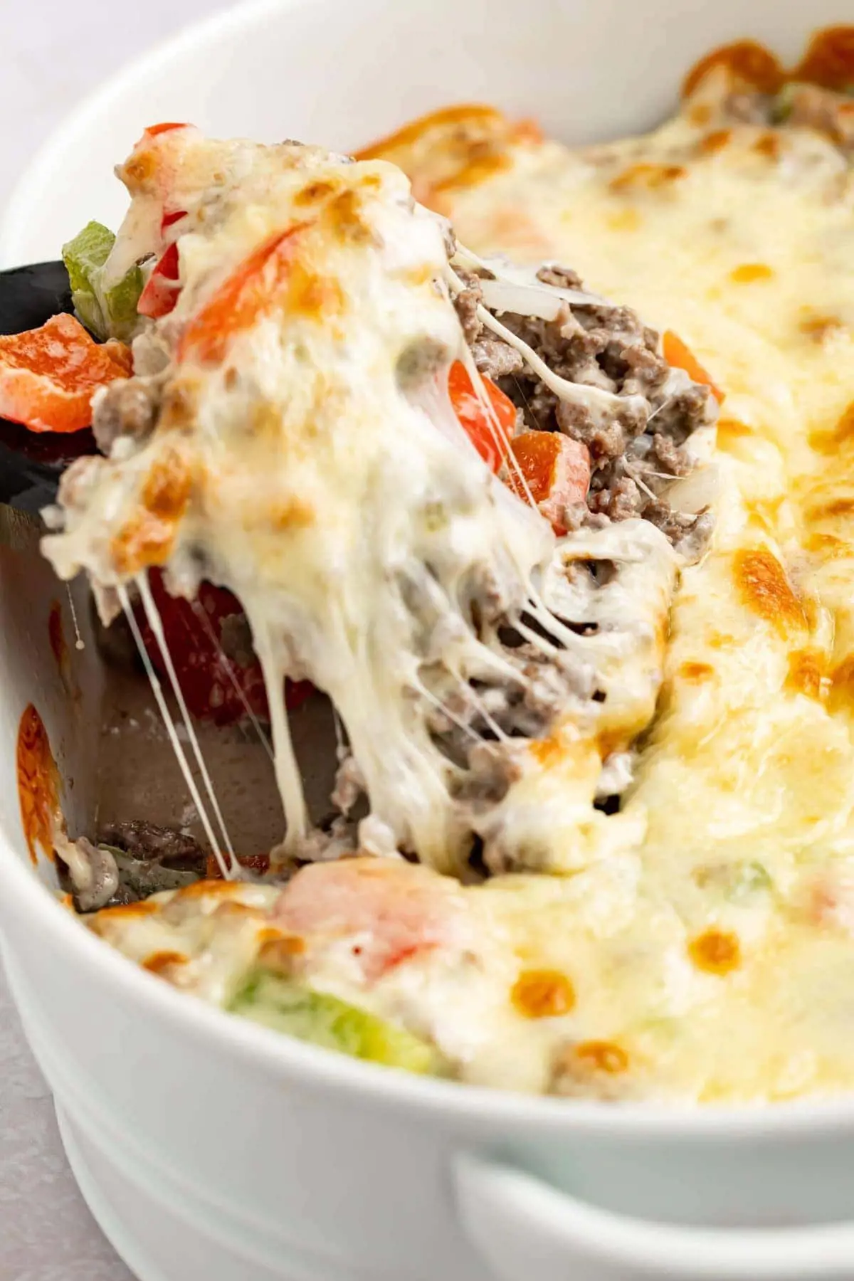 Philly Cheesesteak Hashbrown Casserole is typically made with ground beef, onions, peppers, mushrooms, cheese sauce, and hash browns. All these ingredients are baked together in a casserole dish until bubbly and golden brown, the dish then gets ready to be served.