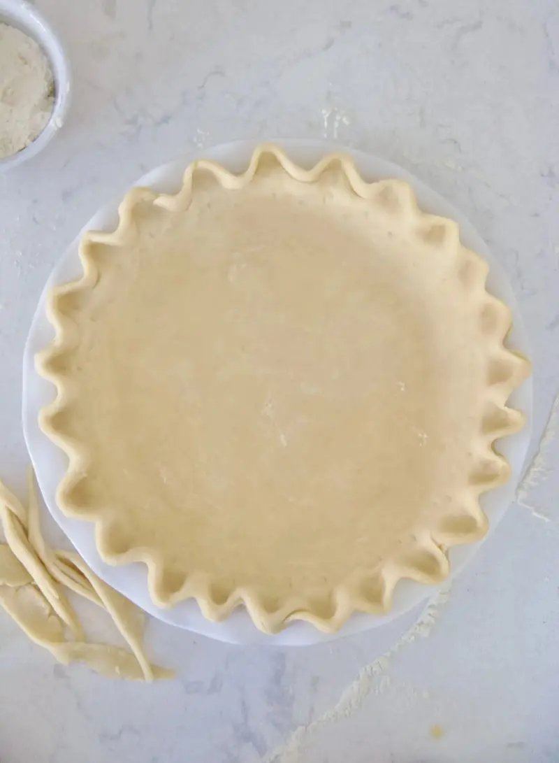 Trim and Crimp the Edges: Trim the excess dough, leaving about a 1-inch overhang. Tuck the overhang under itself to form a thick edge, then crimp or flute the edges as desired. This creates a neat, decorative edge that will also help hold in the filling.