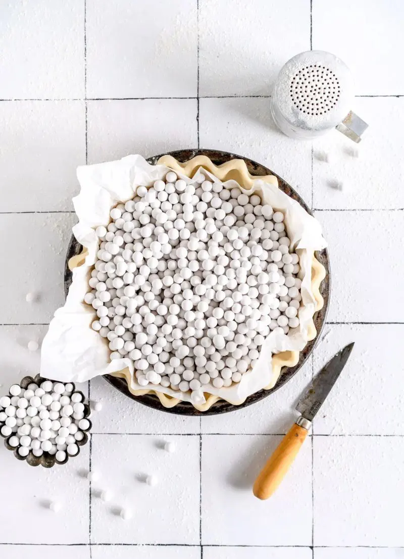 - Add Pie Weights: Fill the lined crust with pie weights or dried beans, ensuring they cover the bottom of the crust and reach up the sides. This weight prevents the crust from puffing up or shrinking during baking.