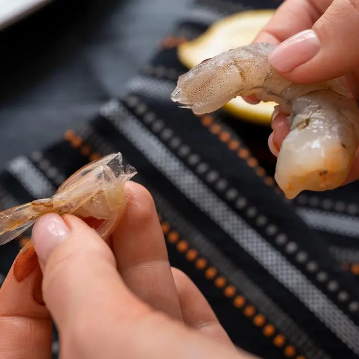 In this method, you have to carefully inspect each shrimp for any remaining impurities or shell pieces. If found, remove debris by hand.