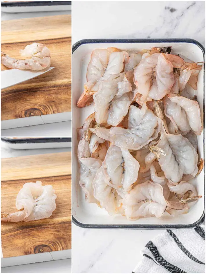 You can begin by placing the shrimp on a clean cutting board or holding them over a bowl.