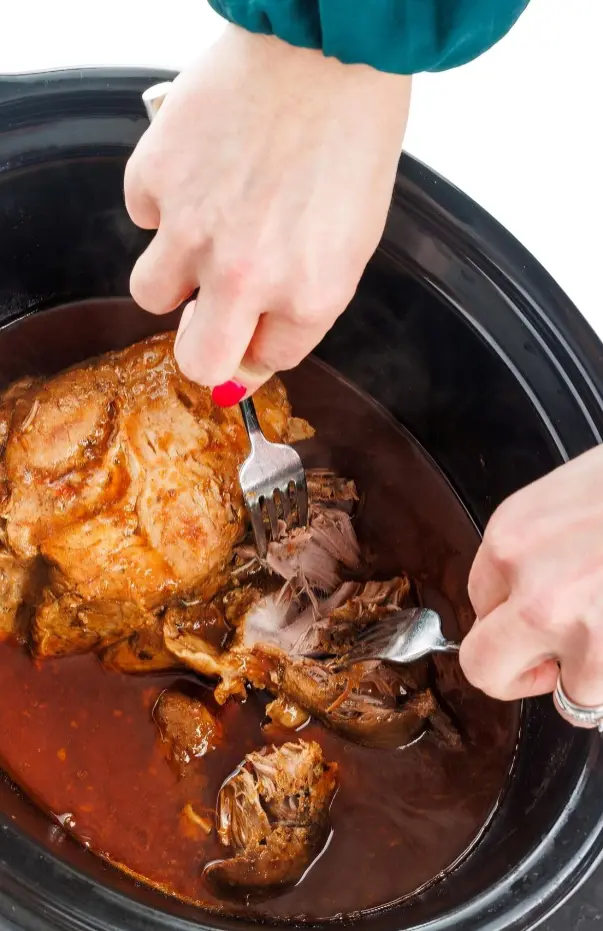 - After waiting patiently, your pork should be super tender. Take it out carefully and put it on a plate. Using two forks, pull the meat apart - it should come apart very easily. Put all the meat back in the slow cooker with the tasty juice and mix it together. Your pork shoulder is ready!