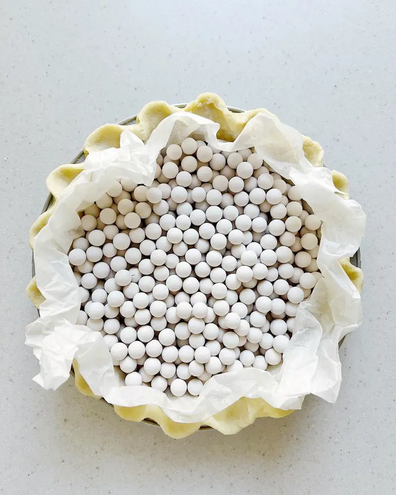 You arrange the dough on the pie dish, with parchment paper on top, fill it with pie weights (or dried beans, if you are doing it simply), and put it in the oven for a while.