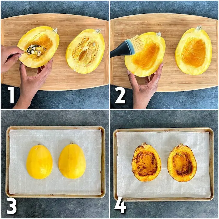 - To prepare it, you should first halve the spaghetti squash from top to bottom and remove its seeds using a spoon. Season the inside with olive oil, salt and pepper.
