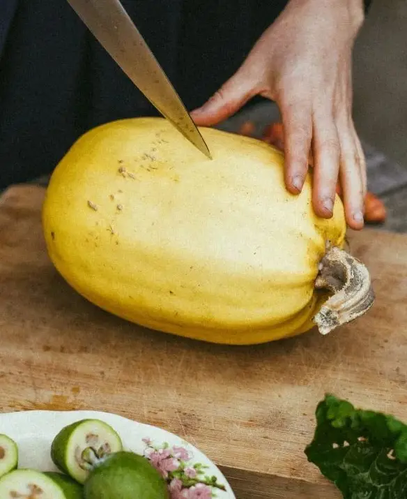 - Insert the tip of the knife at one end of the squash and make a sharp cut along the length. Finally, with your hands, pull apart the halves.