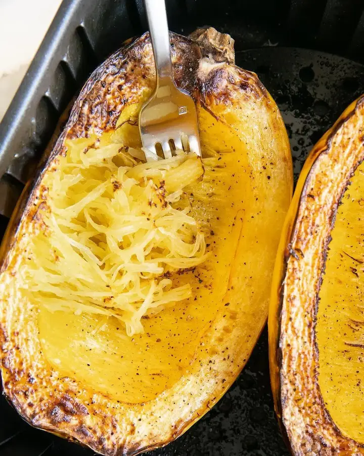 - Roast for about 30-45 minutes to make the flesh tender that can easily be pierced by a fork. To check for doneness, turn one of the halves over and drag a fork over the flesh. If it shreds into strands, it is ready. If not, keep baking for 5-10 minutes while checking in between.