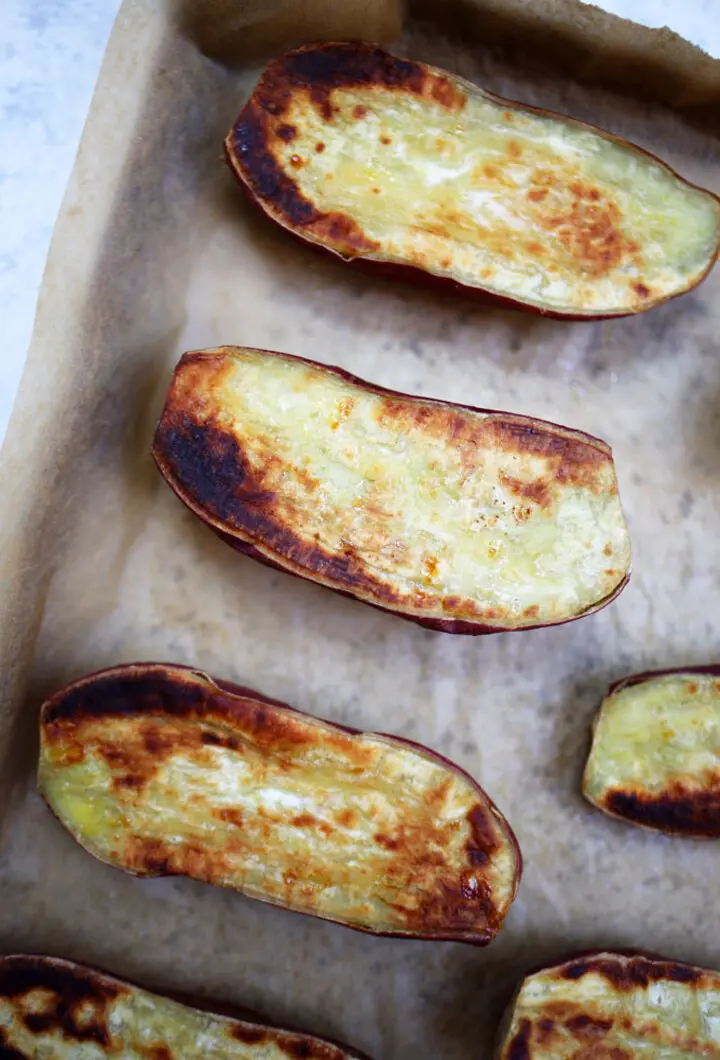 - After that, you have to place the baking sheet in the preheated oven and roast for 25-30 minutes, turning the yams halfway through to ensure even browning. They should be tender on the inside and slightly crispy on the edges when done.