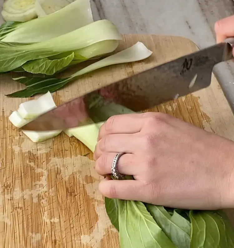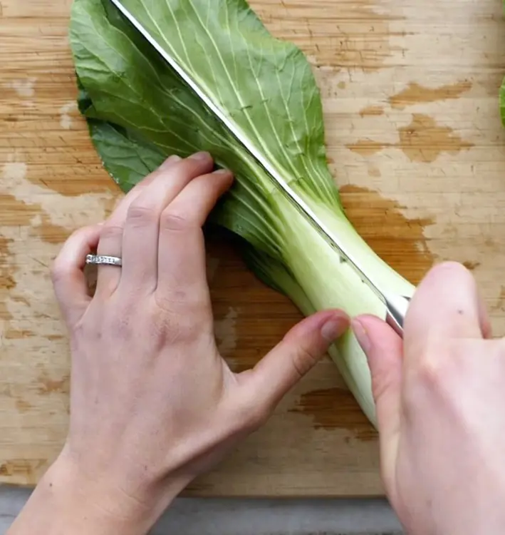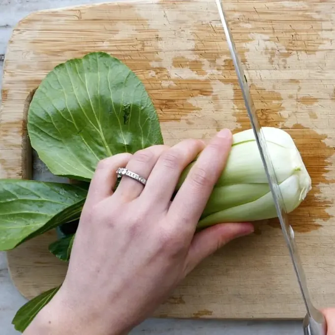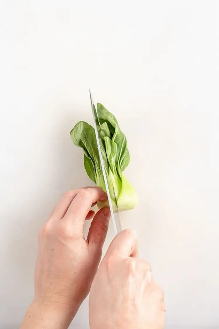 Use a sharp knife to remove about 1/4 inch from the base of the Bok choy. This will get rid of any tough or discolored parts. If using baby Bok choy, you may also skip this step if the base looks fresh and tender.