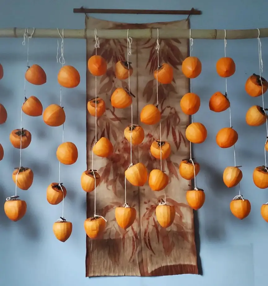 Often popular in Japan(called as hoshigaki), persimmon can also be preserved by drying. To dry, the Fuyu varieties of persimmons are peeled and with the help of stems are hung on bamboo poles or strings, in a cool, well-ventilated area with direct sunlight. After several weeks, the persimmons shrink in size, become wrinkled, and develop a rich, syrupy sweetness.