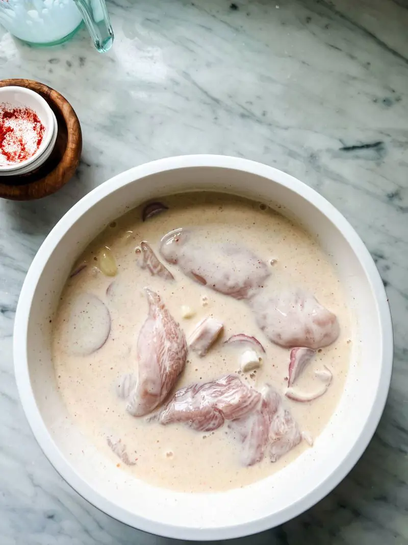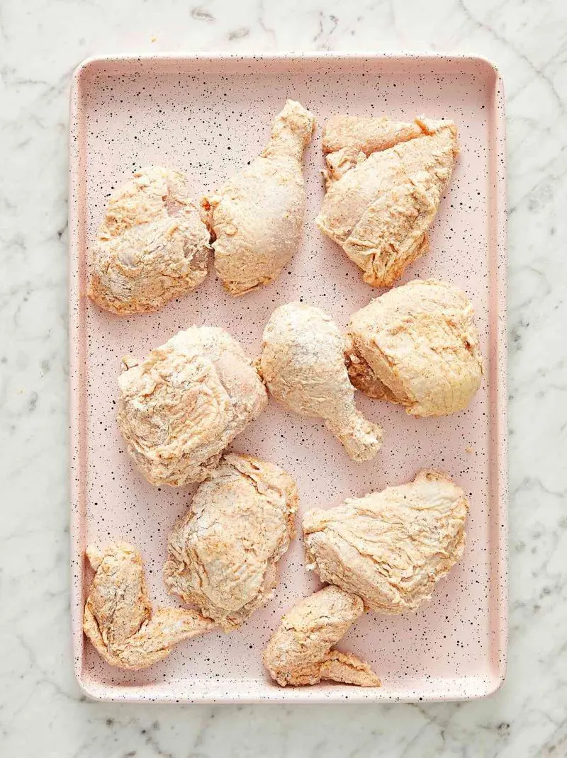 First you need to give your chicken nice buttermilk bath. For this, mix up a simple brine with buttermilk and salt. Then, tuck your chicken pieces into this creamy mixture.