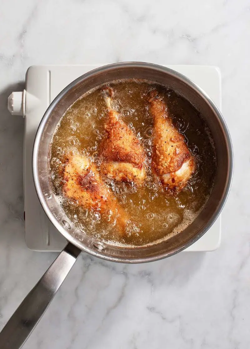 Keep an eye on that chicken as it fries. You want the skin to turn a deep, golden brown - that's your signal for crispy goodness.