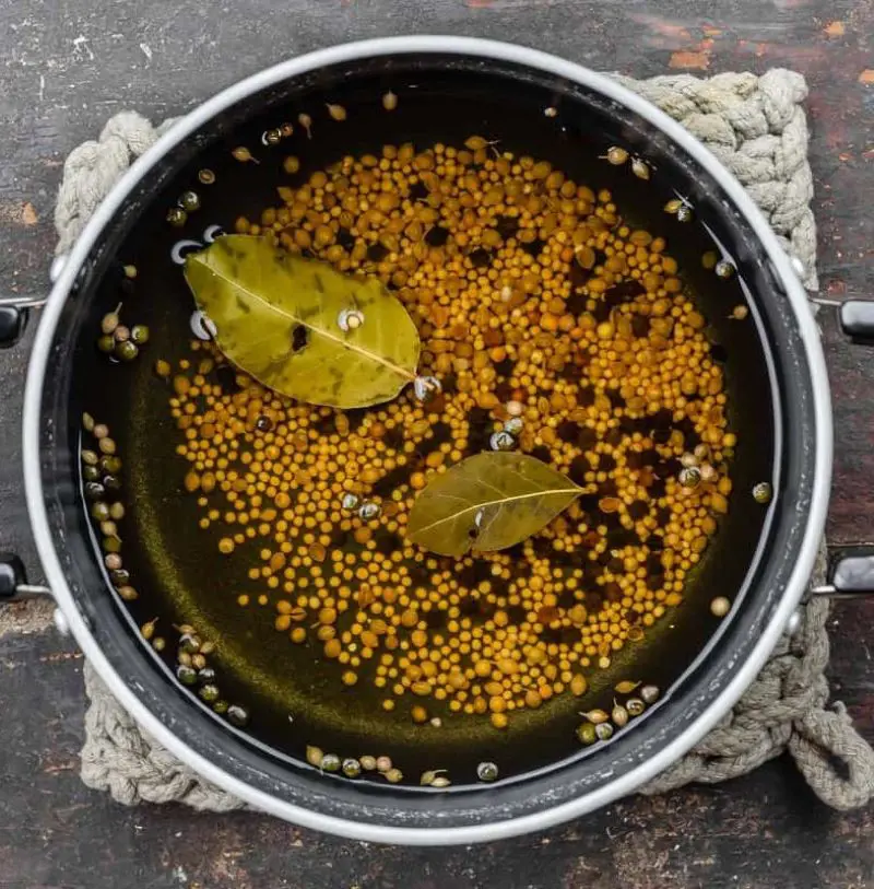 - Once stirred well, place the pot on the stove. We have a few more ingredients left to combine. Include mustard seed, black pepper, and bay leaves into the pot.