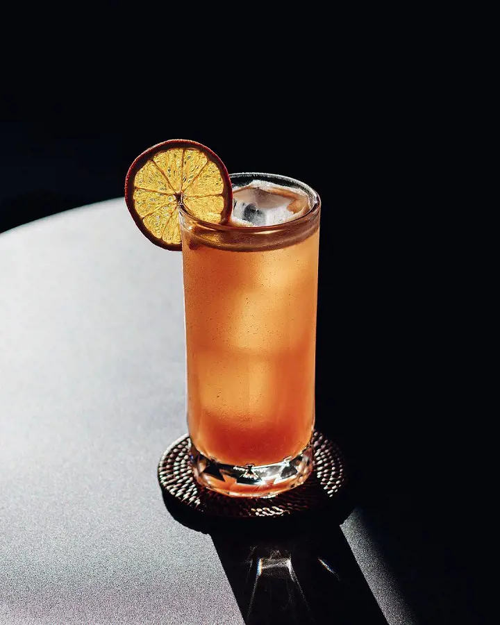 This refreshing drink features bourbon, ginger ale, lime juice, and a maraschino cherry. It has sweet strawberry notes that are balanced by the ginger ale's spicy effervescence and the lemon’s zesty citrus kick.