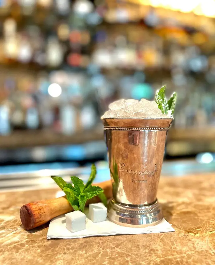 It is made with bourbon, mint, sugar, and crushed ice. The mint is muddled in the sugar and mixed with the bourbon and ice. Everything is stirred until the glass frosts over, and then it is garnished with a sprig of mint for a refreshing and aromatic delight.