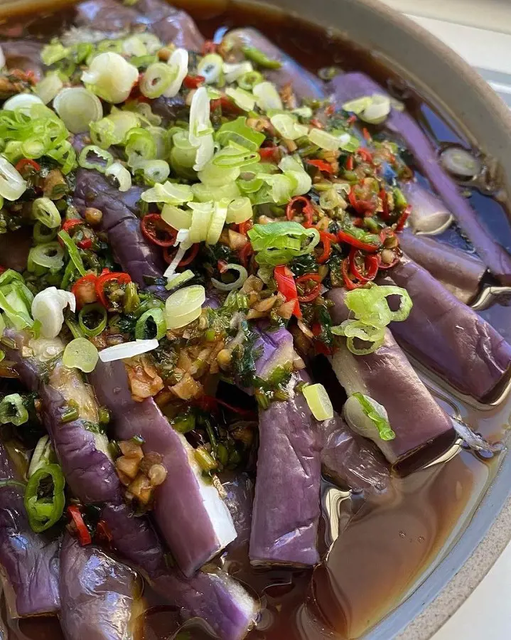 The steamed eggplant dish is a popular vegetable dish because of its juicy, tender texture and sweet flavor. It is made by steaming eggplants until soft and tender, then drizzling them with a flavorful sauce of soy sauce, vinegar, sugar, and sesame oil.
