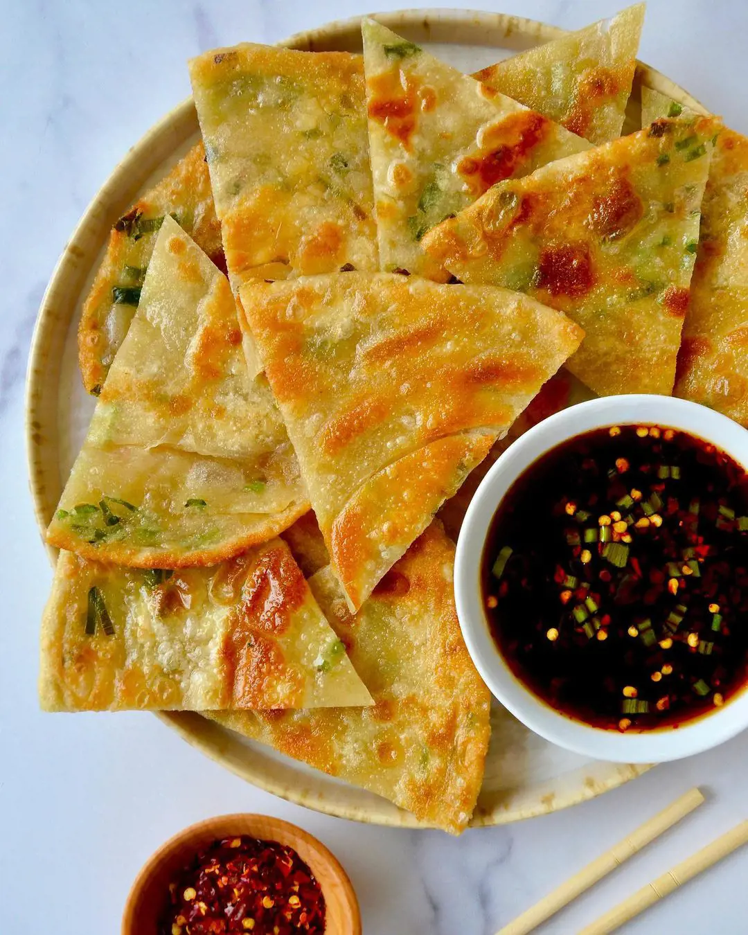 This pancake does not require maple syrup or a medley of fruits. A Chinese scallion pancake is a savory dish made with thin pan-fried dough. The dough is flavored with sesame oil and has bits of scallions.
