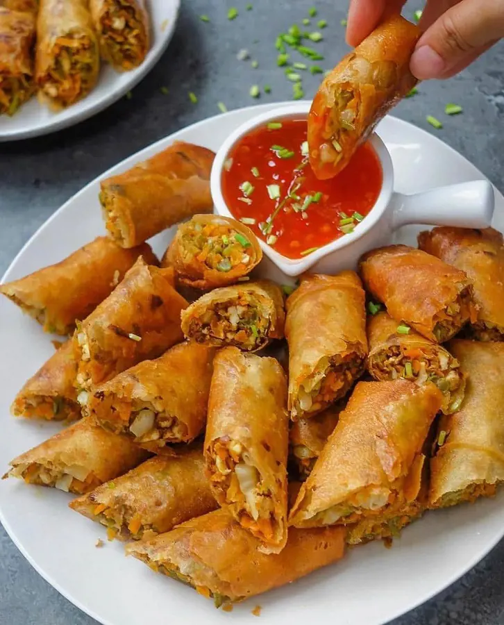 The rolls are stuffed with a tasty filling of various ingredients like minced pork, shredded carrot, bean sprouts, chives, vermicelli, and other vegetables. They are then wrapped in thin dough wrappers and fried until crispy and golden.