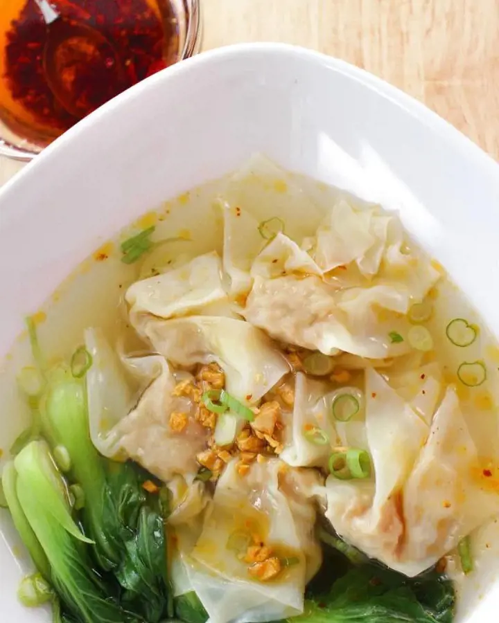 It is usually filled with minced pork or diced shrimp and served in a bowl of comforting broth with cabbage and noodles, but sometimes they are deep fried.