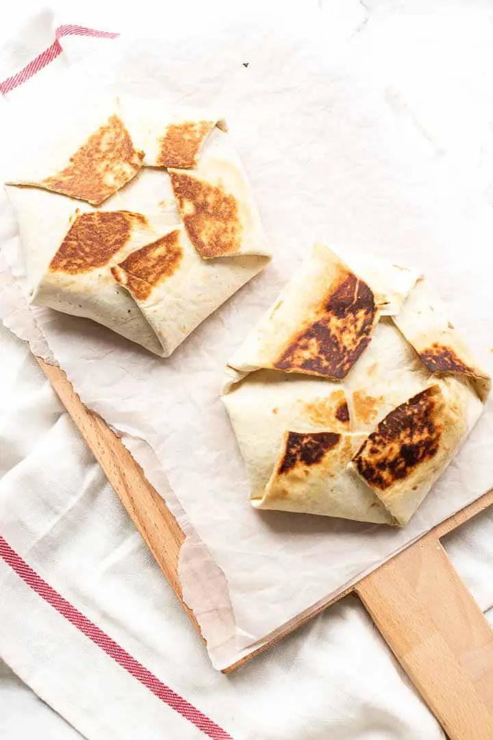 The flavors are reminiscent of a loaded baked potato which forms a filling for this wrap. Once the filling is nestled inside the tortilla, it's folded in such a way that it forms a neat, compact package. This package is then seared on a hot griddle or pan, creating a crispy outer layer that can be enjoyed on-the-go.