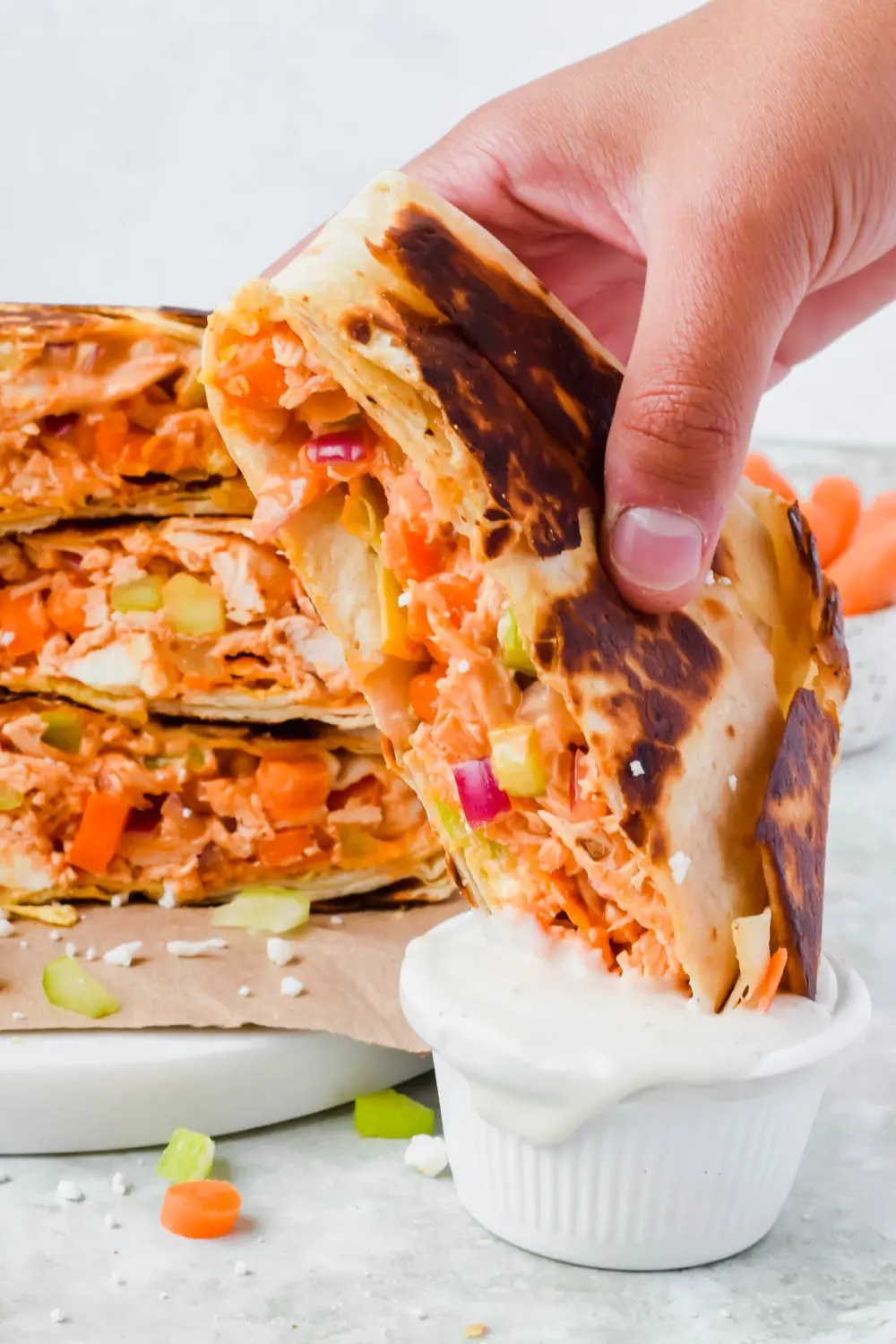 Once assembled, the Buffalo Chicken Crunch Wrap is lightly grilled until the tortilla is crispy and golden brown. The heat from the grill also helps melt the cheese, creating a gooey, cheesy center that complements the spicy buffalo chicken.