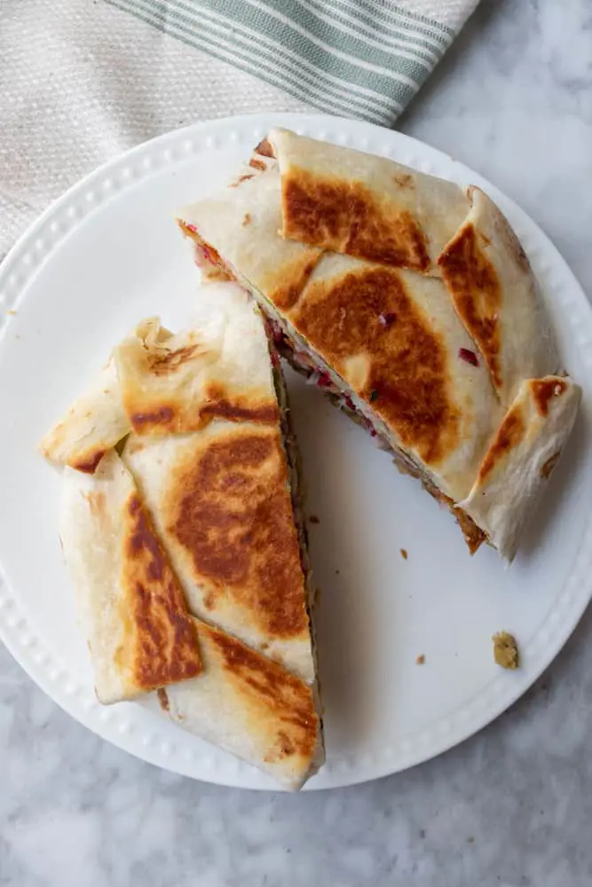 Thanksgiving crunch wrap is defined by the use of Thanksgiving leftovers as the filling inside a soft tortilla. The filling is prepared with a generous portion of succulent roasted turkey cooked in traditional Thanksgiving spices. Surrounding the turkey are classic Thanksgiving sides, such as creamy mashed potatoes, buttery corn, and flavorful stuffing.