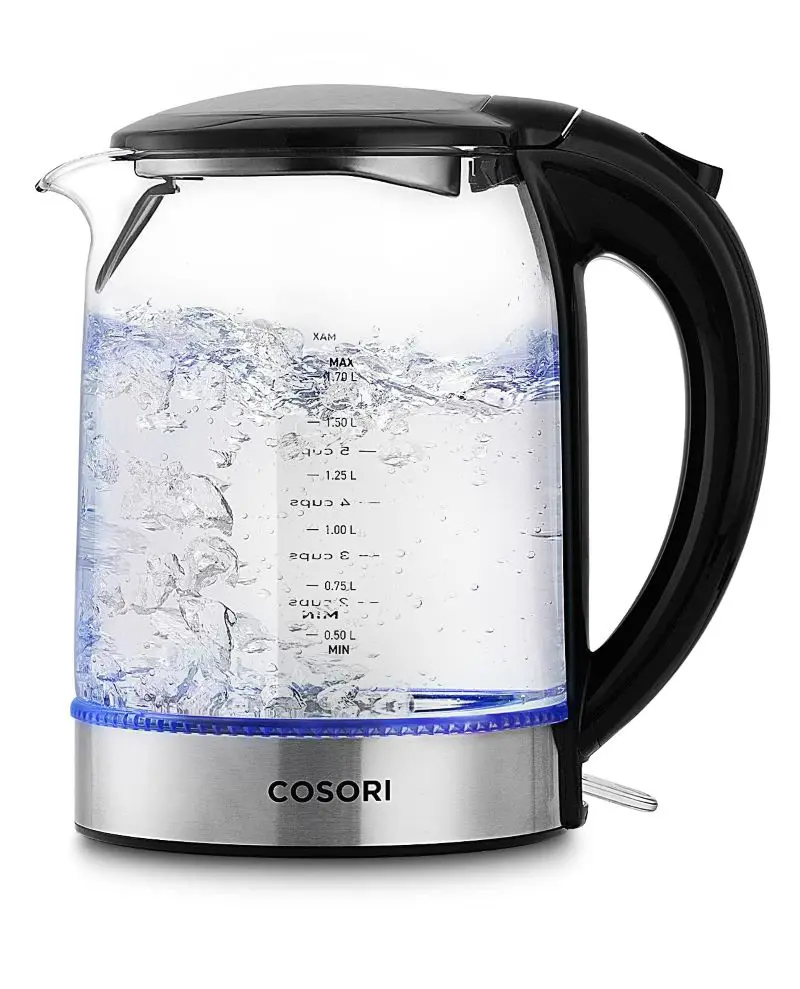 The Cosori excels in affordability, ease of use, and durability, featuring borosilicate glass that withstands high temperatures. Though heavier, the rounded handle ensures a robust grip. The kettle is equipped with a built-in blue LED at the bottom, signaling boiling with an automatic shut-off feature. Powered by a British Strix thermostat and 1500 watts, it rapidly boils water in 3 to 7 minutes, ensuring quick access to hot water.