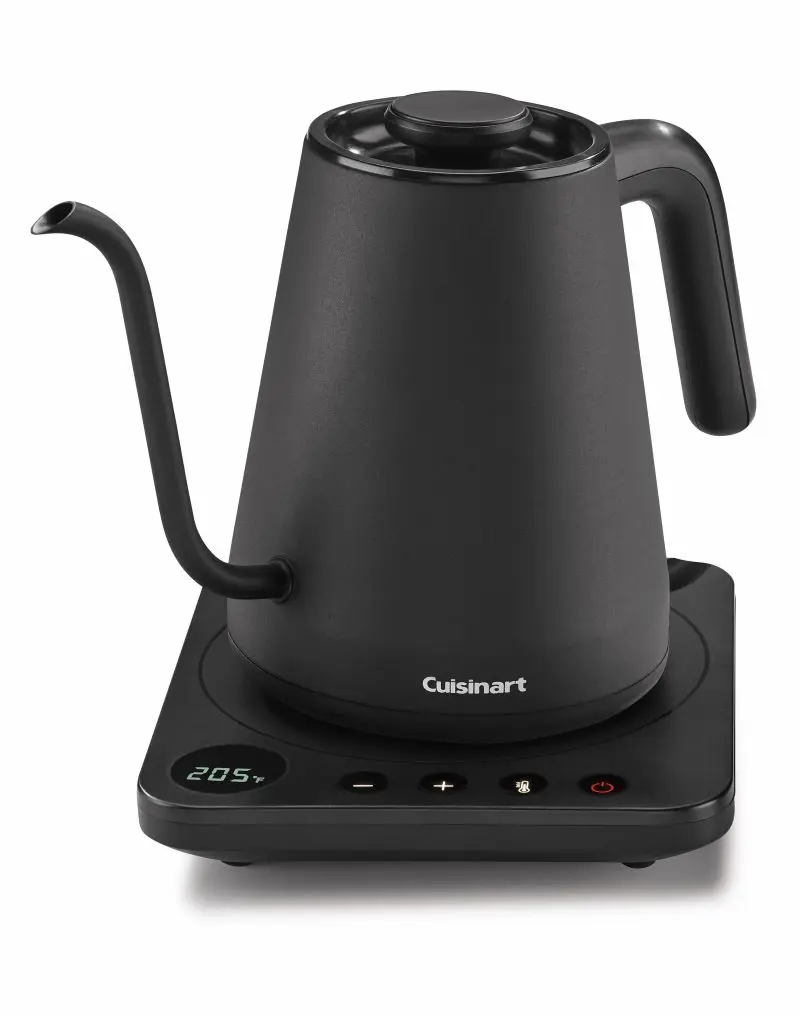 The Cuisinart GK-1 Digital Gooseneck Kettle stands out for its accuracy and speed, offering a more comfortable user experience compared to other gooseneck kettles in a similar price range. The slender spout ensures precise control, ideal for achieving the perfect pour-over, while the rounded handle enhances grip for a smoother and more accurate pour.