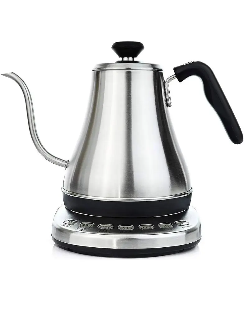 The Fellow's Stagg EKG kettle features a distinctive gooseneck spout that truly resembles a goose's neck. It's perfect for pour-over coffee enthusiasts, offering precise control while pouring water over coffee grounds. With a temperature control knob and LCD display, you can effortlessly heat water to your preferred temperature.