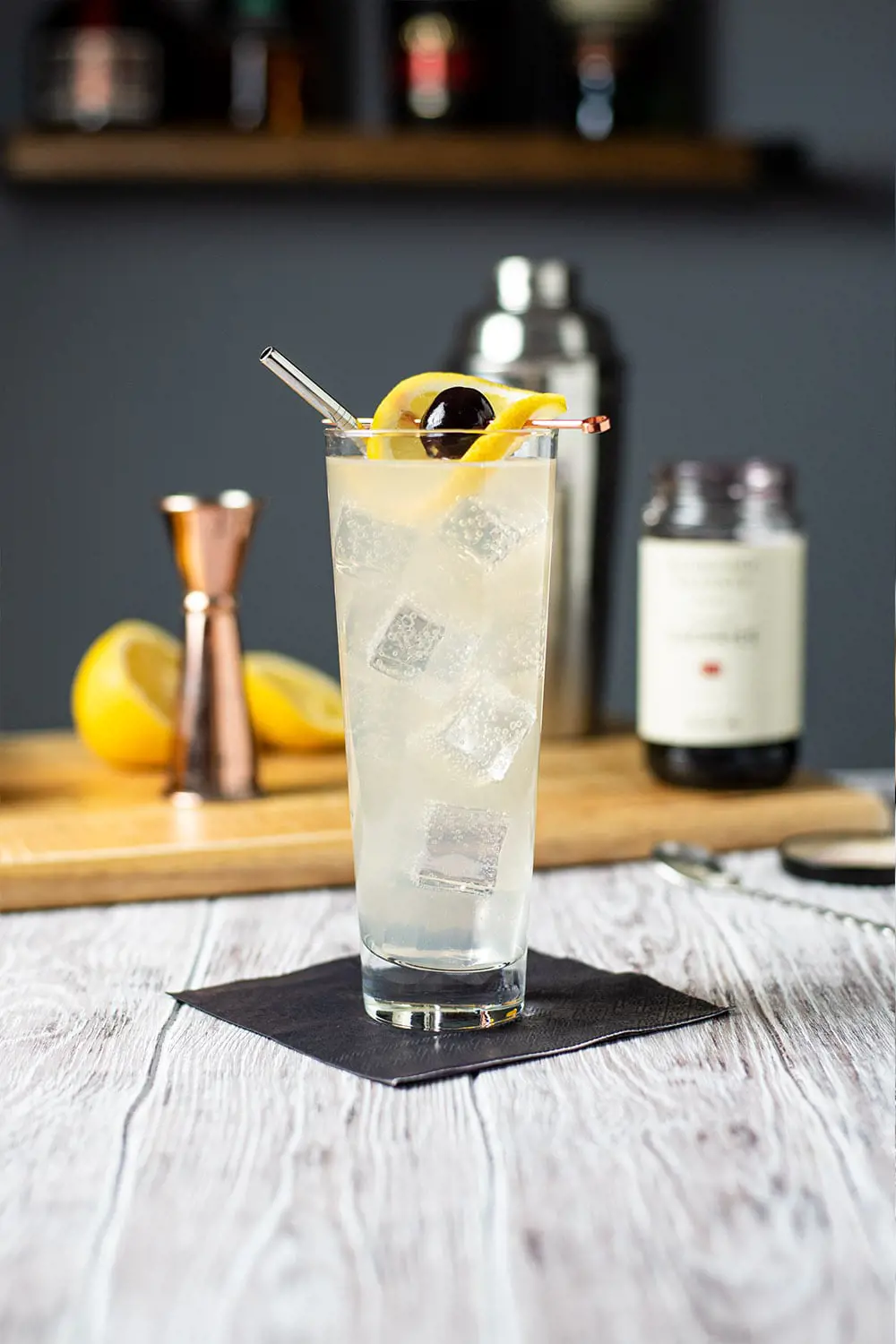 The drink gets its name from "Old Tom" style gin. Easy to assemble and consumed worldwide, this refreshing cocktail remains popular today. The Collins glass shows off the transparent lemony mixture.