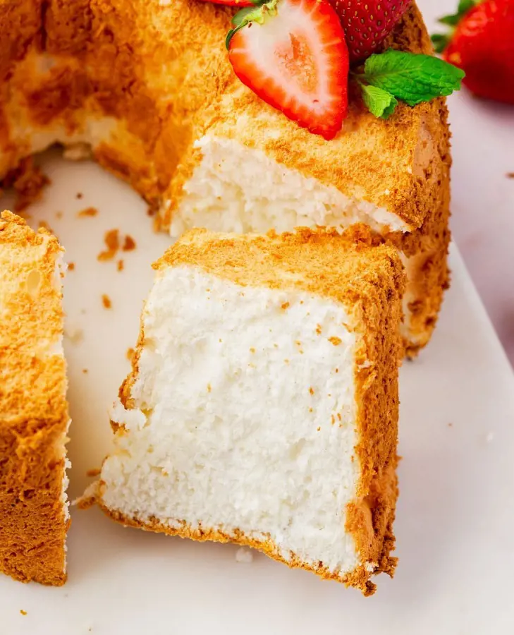 The cake is fluffy and light, making it a great dessert for warmer days. The key to a delicious angel food cake is egg whites separated and whipped to stiff peaks. These peaks create the signature airy and delicate structure of the cake.