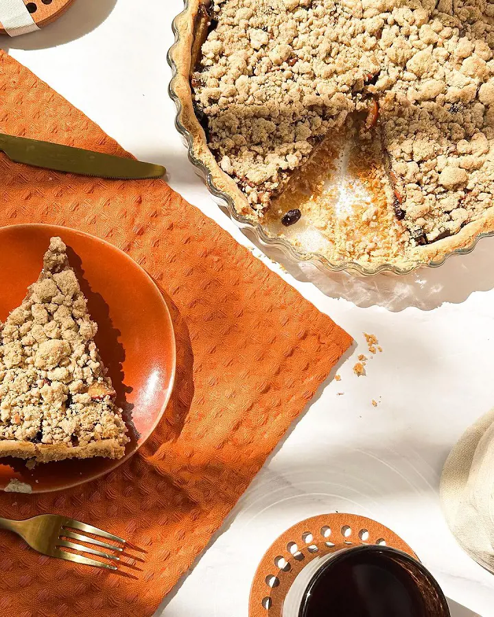 You can jazz it up with some nuts, raisins, or other fruits in the filling and flavor it with ground cinnamon, nutmeg, and ginger. The apples are rich, soft, and gooey, making it a lovely canvas for crunchy topping.