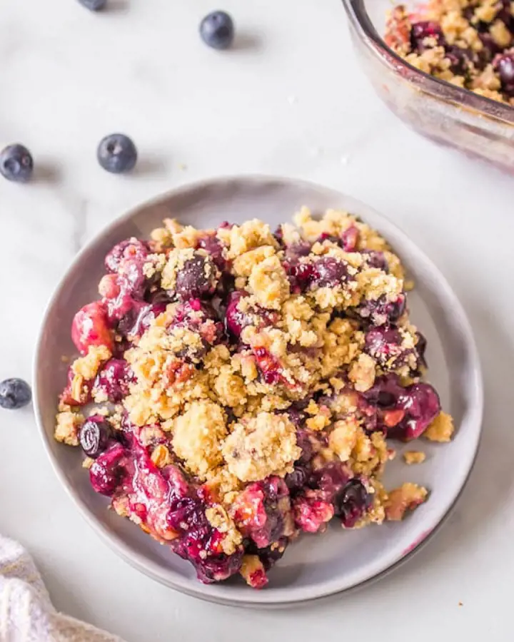 If you want to change it up, you can replace the blueberries with raspberries, blackberries, or cherries and add chopped nuts like almonds, pecans, or walnuts to the topping for extra crunch and texture.