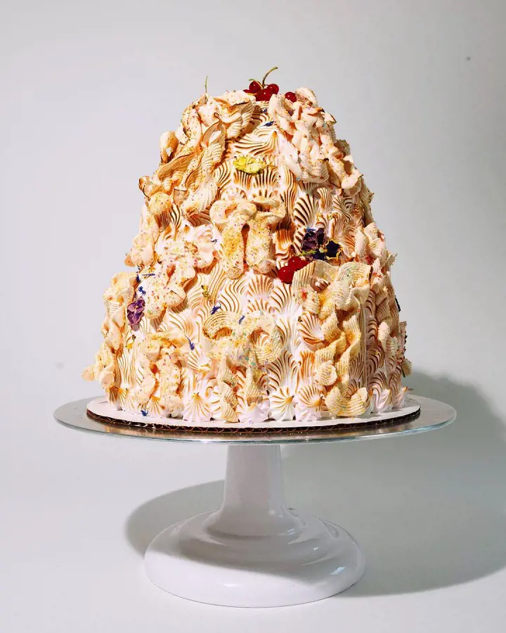 Whisk egg whites past the foamy stage to soft peaks. Add sugar and continue whisking until the peaks are thick and glossy. Fold in cream of tartar and cornstarch and bake. Once baked and cooled, top the meringue with whipped cream and peach glaze.