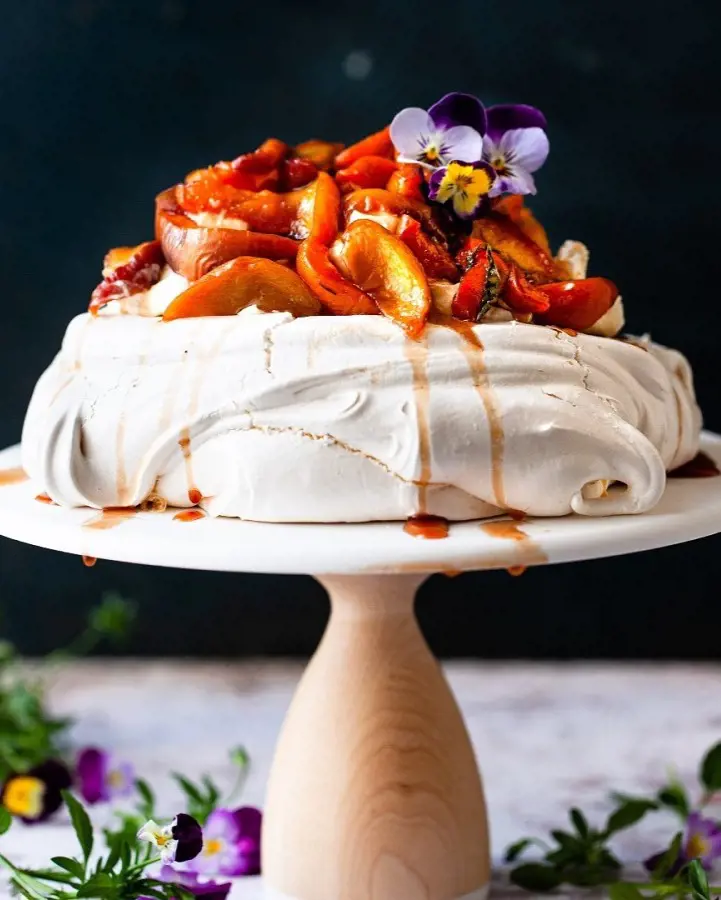 The sublime combination of juicy peaches, billowy whipped cream, and chewy-crisp meringue of a peach pavlova will make you swoon. It makes quite the impression on any dessert table.