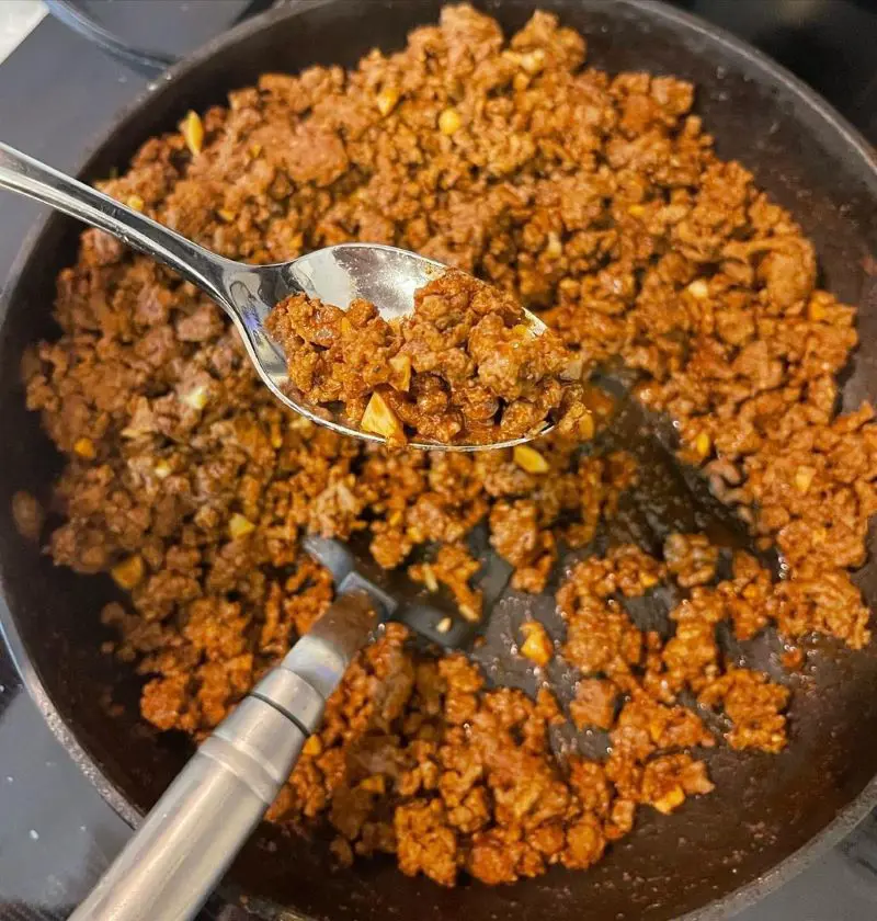Once mixing the ingredients evenly, leave the ground beef to brown for about 8-15 minutes. Cover the pan with a lid and leave it alone. A perfectly browned meat will have no pink color left, so make sure yours also is fully browned.