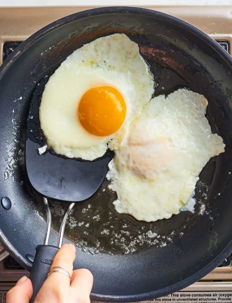 Let the eggs cook undisturbed. The whites will start to set while the yolk remains runny. This usually takes about 2-3 minutes. You can cover the skillet with a lid to help the top of the eggs cook without flipping.