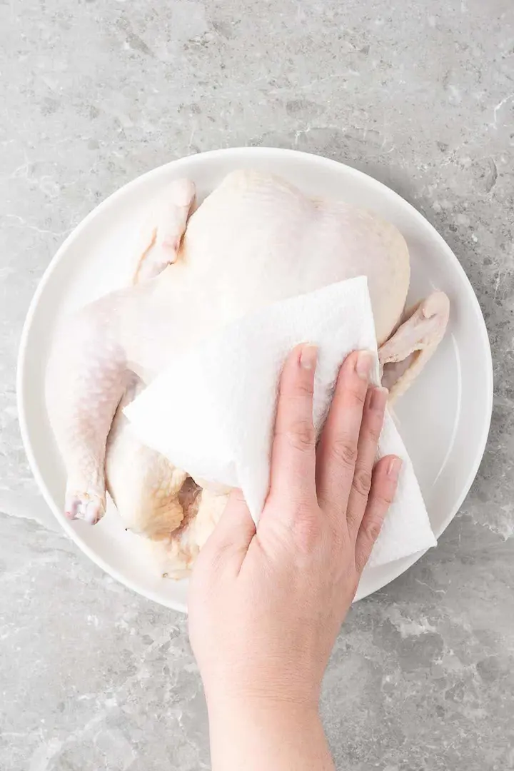 This step is important because it ensures that the seasoning sticks to the chicken skin. Make sure to remove as much moisture as possible in this step.