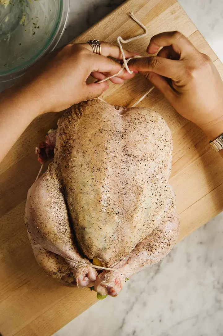 This step is entirely optional but trussing the chicken helps lock in moisture and flavor from the chicken. To truss, simply tuck the chicken wings inside and use kitchen strings to tie them together.