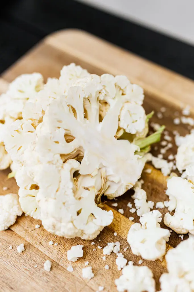 Stand the cauliflower upright on your cutting board, stem facing down. Identify the large, tough leaves surrounding the main vegetable head. Grasp these leaves firmly at their base and pull them away from the core.