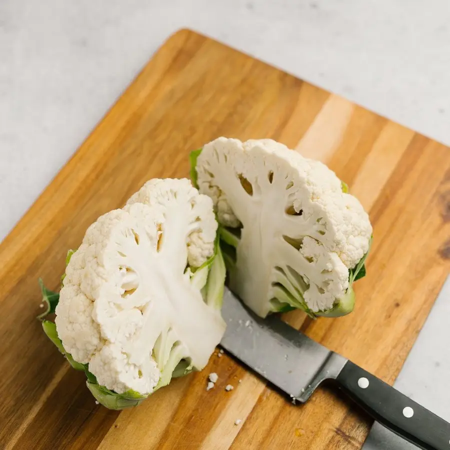 Place the cleaned cauliflower on a stable cutting board with the stem facing downward. Using a sharp chef's knife, cut the entire head precisely in half through its center.
