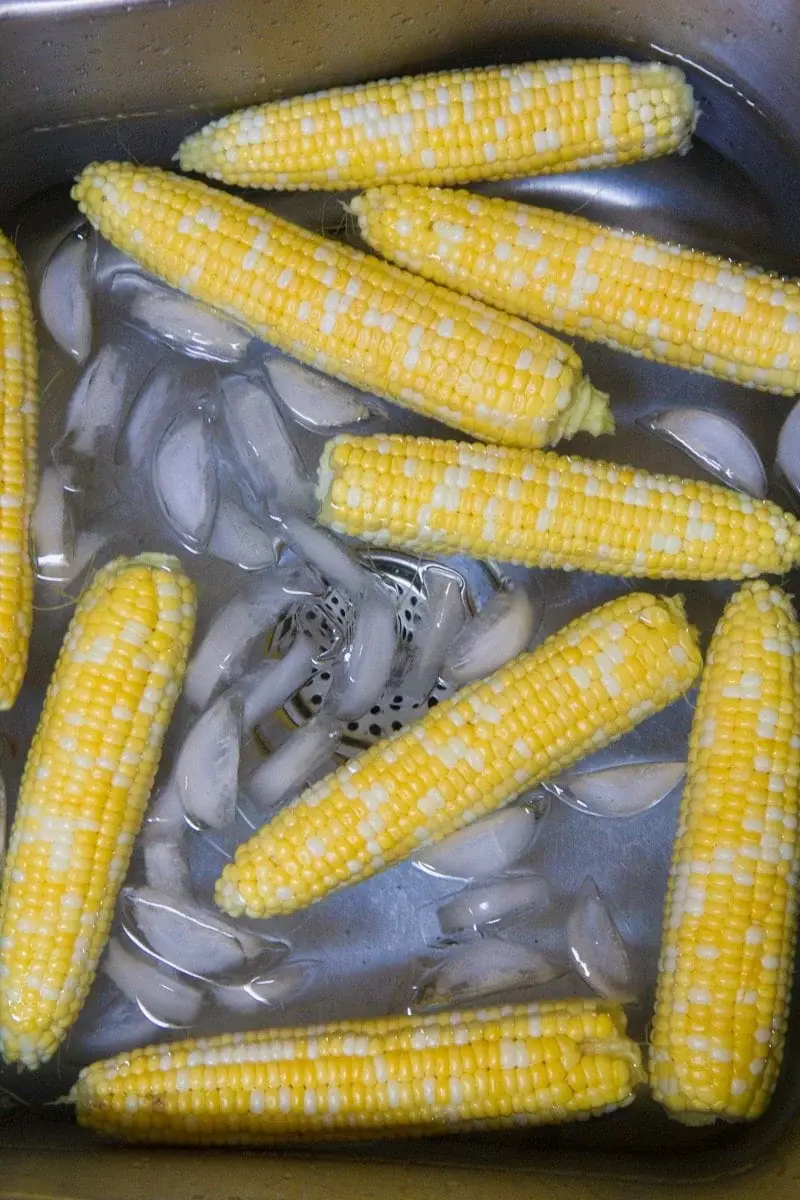 The next step would be to cool down the boiled water. So, here you will transfer the corn to the ice water and let it cool for a few minutes. The cooling effect will reduce the chance of corn cobs being damaged. After cooling them you can remove the corn from the water and pat dry them.