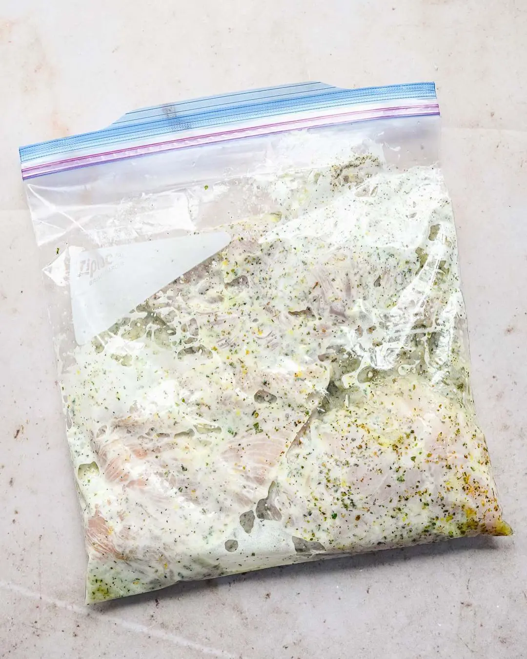 Transfer the marinade into the zip lock bag with the chicken, seal it securely, and place it in a baking dish (to catch any leaks). Twirl the bag to ensure all parts of the chicken are coated.