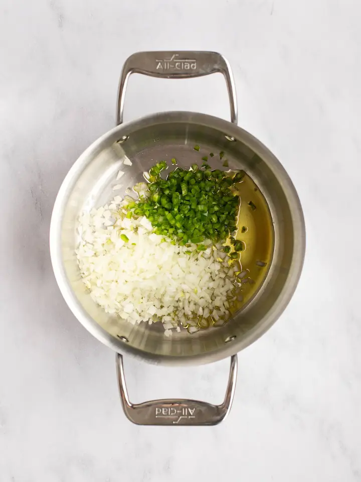 Begin chopping up your veggies. Finely dice onions, jalapenos, and garlic before you begin the cooking process. If you want to keep your rice on the mild side, avoid adding any seeds from the jalapeno.