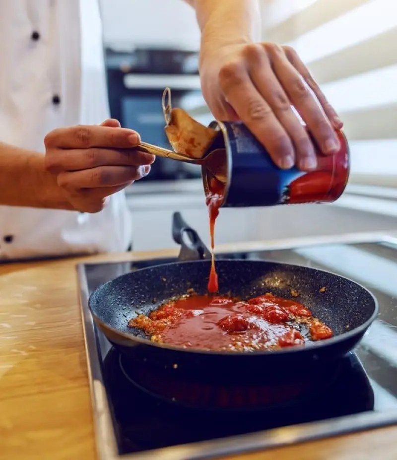 Choosing fresh tomatoes requires you to blanch them first, drain and peel off the skin, and mash tomatoes using the back of the spatula. Or you can blend the tomatoes in a mixture for a faster way.
